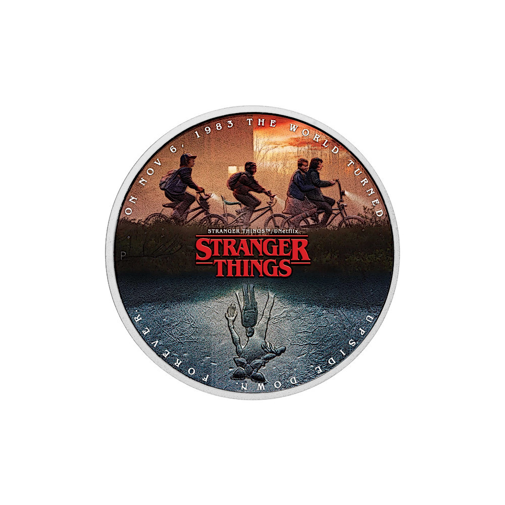 Den fargerike baksiden av mynten viser den mystiske verdenen til Hawkins. Den øverste halvdelen av mynten viser Mike, Dustin, Lucas og Elleve på en eventyrlig sykkeltur, mens den nederste halvdelen viser den uhyggelige Upside Down med Will og den illevarslende tilstedeværelsen av en demogorgon. Designet inkluderer inskripsjonen "ON NOV 6, 1983 THE WORLD TURNED UPSIDE DOWN. FOR EVIG." sammen med "STRANGER THINGS"-logoen og Perth Mints "P"-myntmerke.