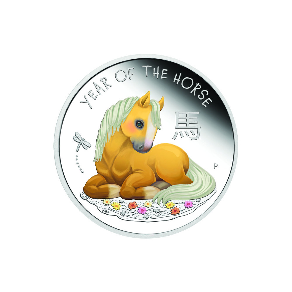 Baksiden av mynten har et fargerikt motiv av et lykkelig føll som hviler på gress dekorert med delikate blomster, med en øyenstikker som flyr over. Designet inkluderer også det kinesiske tegnet for "hest", inskripsjonen "YEAR OF THE HORSE" og Perth Mints "P"-myntmerke.