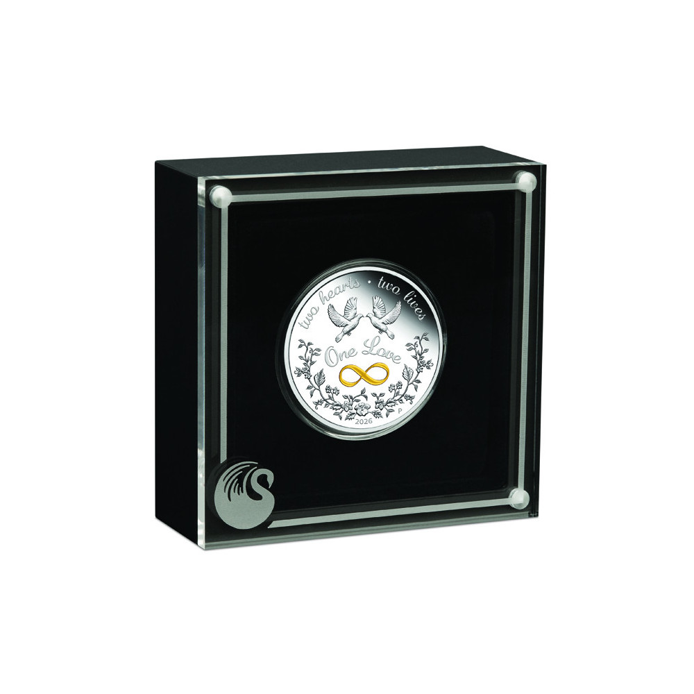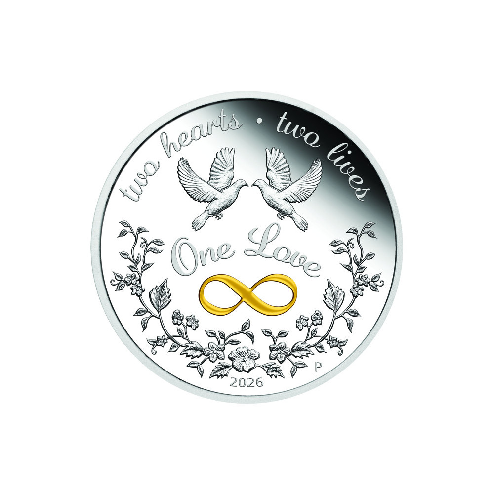 På baksiden av mynten er det to duer og et fargerikt uendelighetssymbol og inskripsjonene "ONE LOVE", "TWO HEARTS", "TWO LIVES" og årstallet for pregingen - 2026.