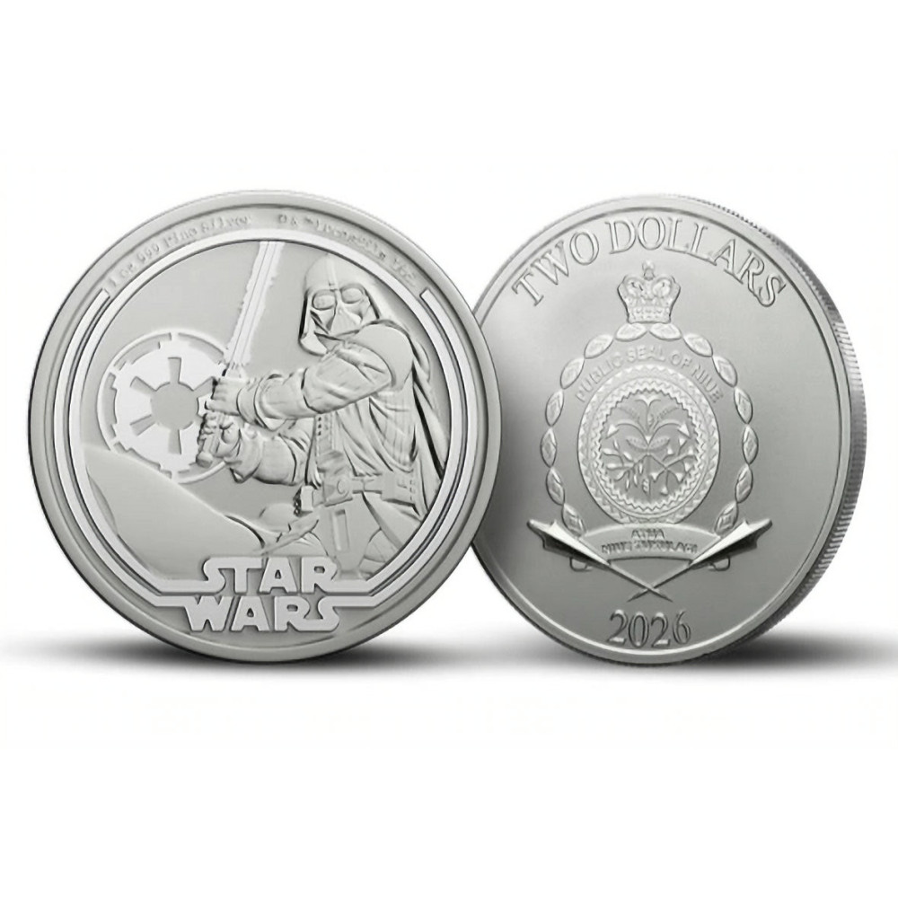 Forsiden av Niue "Star Wars: Darth Vader"-sølvmyntene fra 2026 viser Niues statssegl. Det nasjonale emblemet viser den lokale floraen i midten av en sirkel av skjell, og over denne stikker statskronen opp, som symboliserer forbindelsen mellom Niue og Commonwealth.